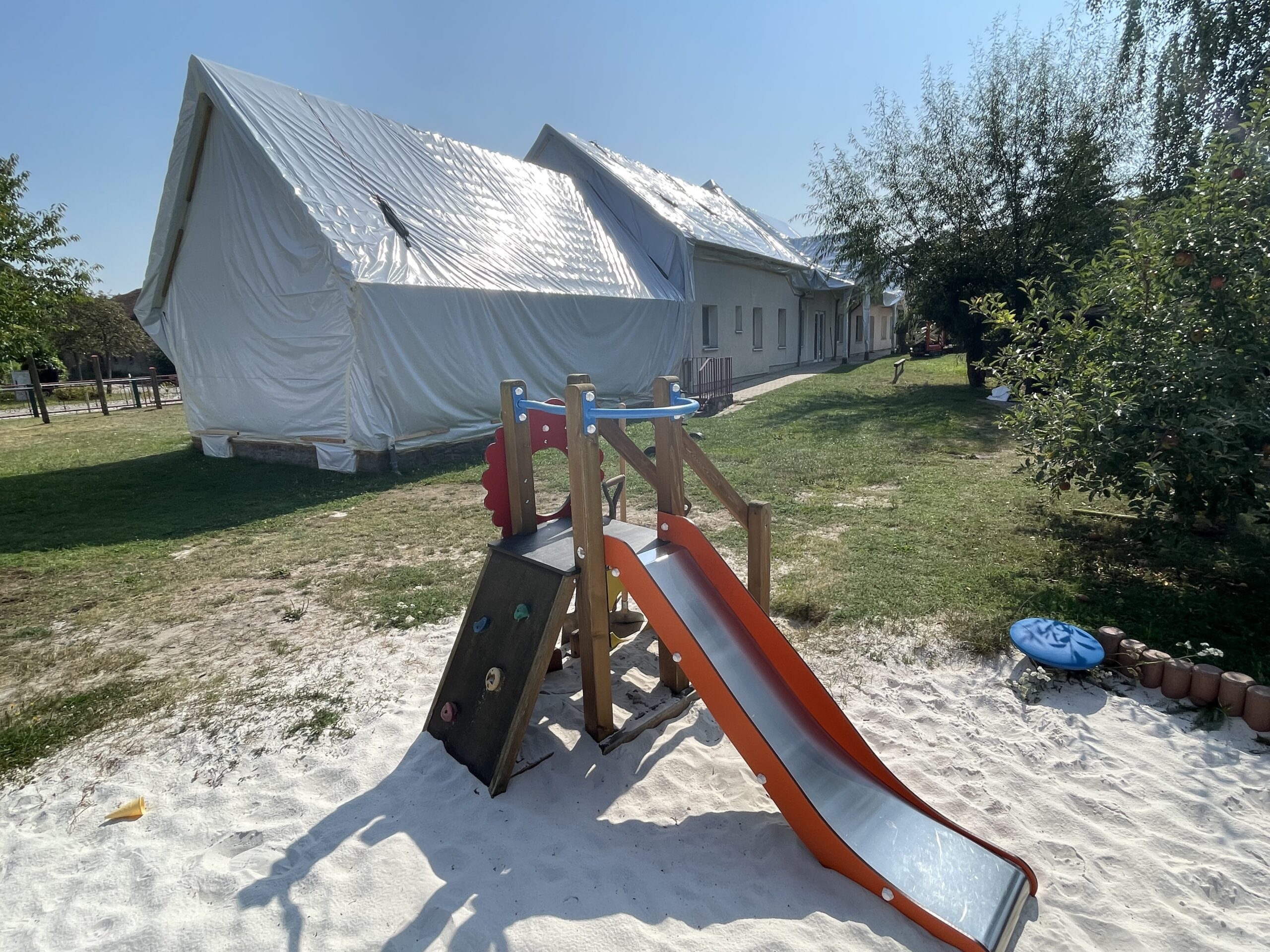 Bei der Kita wurde ein sehr starker Befall des Hausbocks festgestellt. Selbst in einigen Gruppenräumen war der Hausbock schon sehr aktiv. Hier war dringender Handlungsbedarf. Über die Verwaltungsgemeinschaft wurde ein Gutachter beauftragt, welcher nach Ausschluss anderer Verfahren das Begasugnsverfahren vorgeschlagen hat.